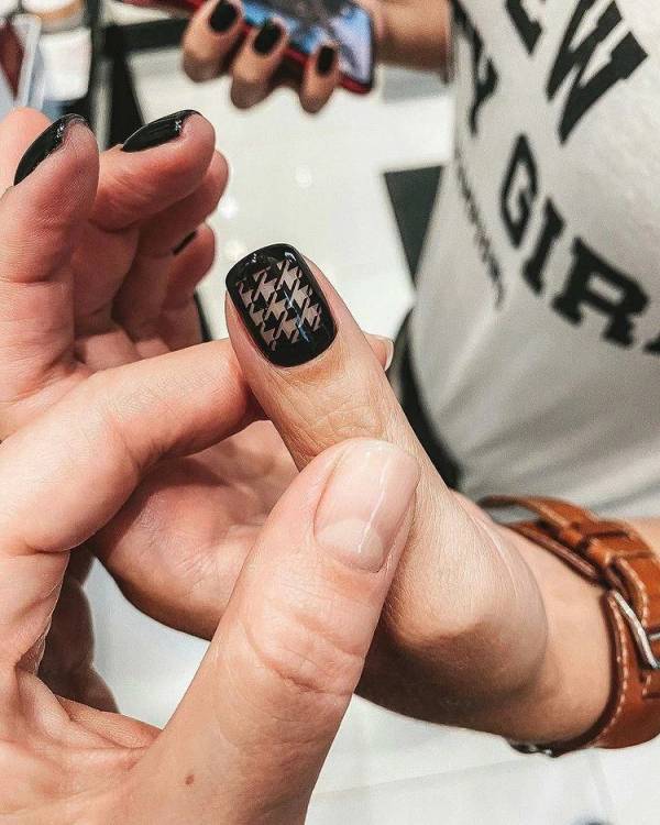 Принт «гусячі лапки» — класика кожної зими, і тепер він знову в тренді, і доказом є те, що на останньому показі колекції Chanel Métiers d’art цей принт був найулюбленішим. Тепер справа доходить і до нігтів. Звичайно, для цього потрібно бути художником чи скористатися наклейками.