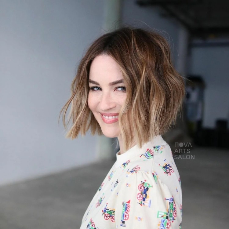 Використовуйте щипці для завивки, щоб надати волоссю до плечей деяку легкість. Фарбування омбре надає яскравість образу і обсяг тонкому волоссю.