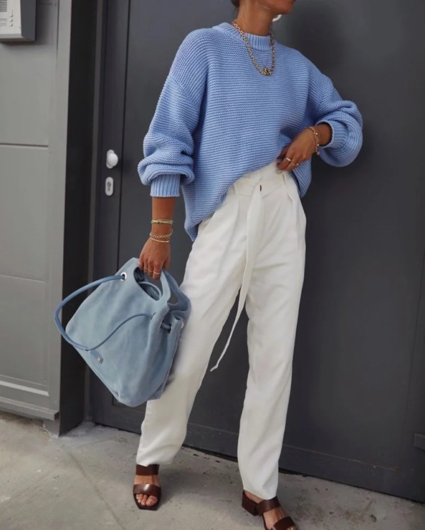 Трендові брюки з високою посадкою прямого крою або розміру оверсайз можна «подружити» з яскравим в’язаним светром вільного крою – вийде базове і універсальне поєднання двох речей, яке створює ідеальний образ, як на кожен день, так і для святкового заходу. В якості взуття до подібної трендової композиції підійдуть білі кросівки, а також мінімалістичні босоніжки на невеликому квадратному каблуці.