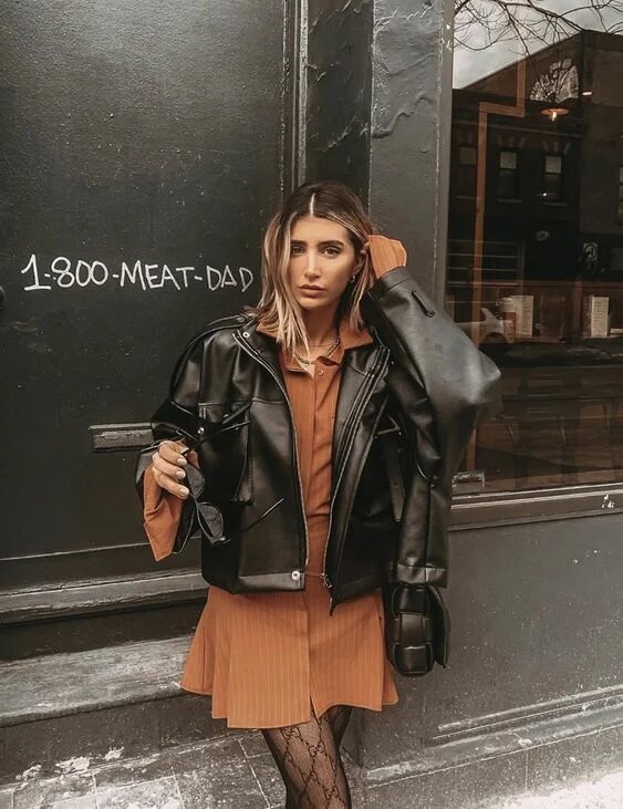Шкіряні косухи рудого кольору в мінімалістичному стилі – актуальні, їх сміливо можна поєднувати, як з однотонними осінніми нарядами, так і строкатими речами.