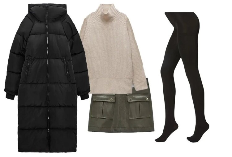 За тим же принципом вибираємо до спідниць / суконь і колготки. Коли на нас надіті речі з щільних, фактурних матеріалів, а зверху – шуба або пуховик, набагато логічніше вибирати щільні непрозорі колготки. Все, що по щільності менше 40 ден, буде візуально “сперечатися” з теплим верхом.