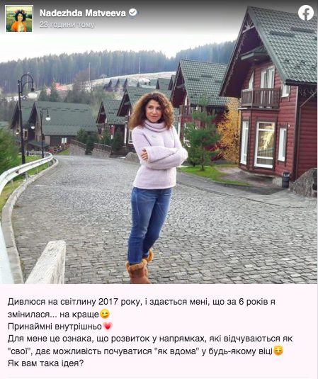“Дивлюся на світлину 2017 року, і здається мені, що за шість років я змінилася… на краще. Принаймні внутрішньо. Для мене це ознака, що розвиток у напрямках, які відчуваються як “свої”, дає можливість почуватися “як удома” у будь-якому віці” – прокоментувала телезірка.