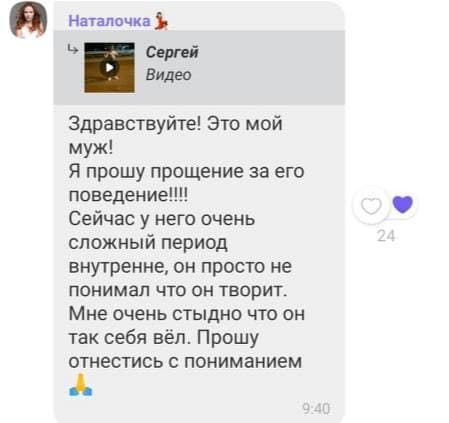“Я перепрошую за його поведінку!!! Зараз у нього дуже складний період внутрішньо, він просто не розумів, що він робить. Мені дуже соромно, що він так поводився”, – написала Наталка.