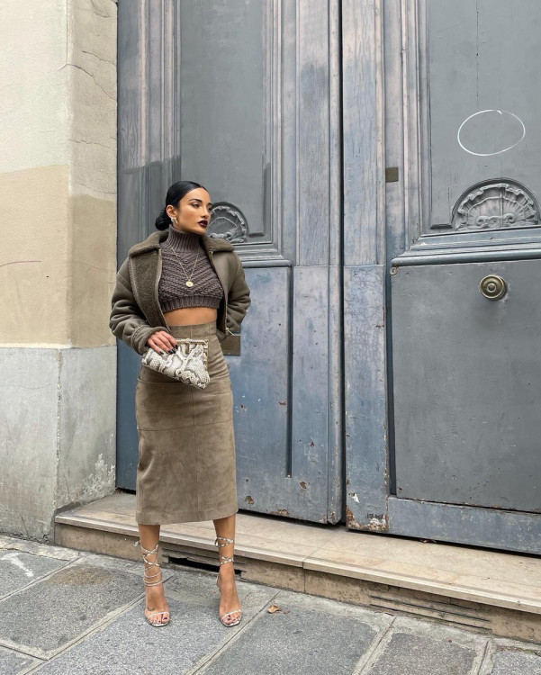 Короткий верх і спідниця-олівець в поєднанні з бомбером – бомба образ для ранньої осені. Ця тенденція з відкритою лінією живота за прогнозами дизайнерів залишиться з нами надовго.