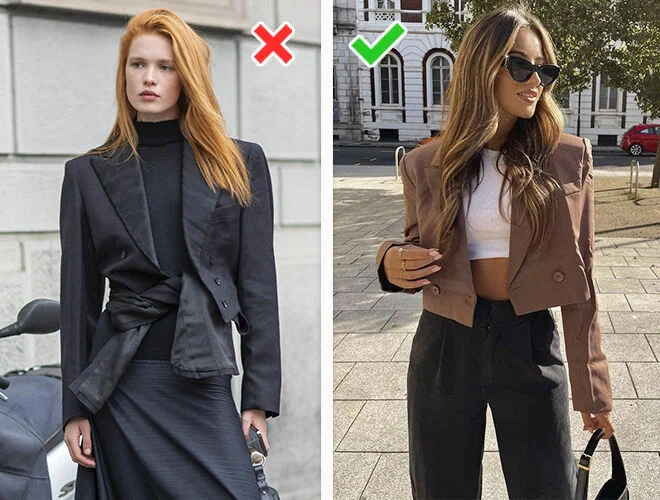 Ніщо з верхнього одягу так не підкреслює талію і не подовжує ноги, як кроп-жакет. Правда, дуже легко вибрати не ту модель і перетворитися на стареньку. У дівчини ліворуч модель з дуже широкими лацканами та поруч із кількох дрібних гудзиків. Таке не носимо.