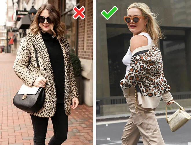Молодить: кольоровий леопардовий принт у сучасному виконанні — середньої величини, як на фото з правого боку, з чіткими краями. Відмінний варіант для зухвалих виходів та поєднання з діловими брюками та романтичною атласною сукнею.
