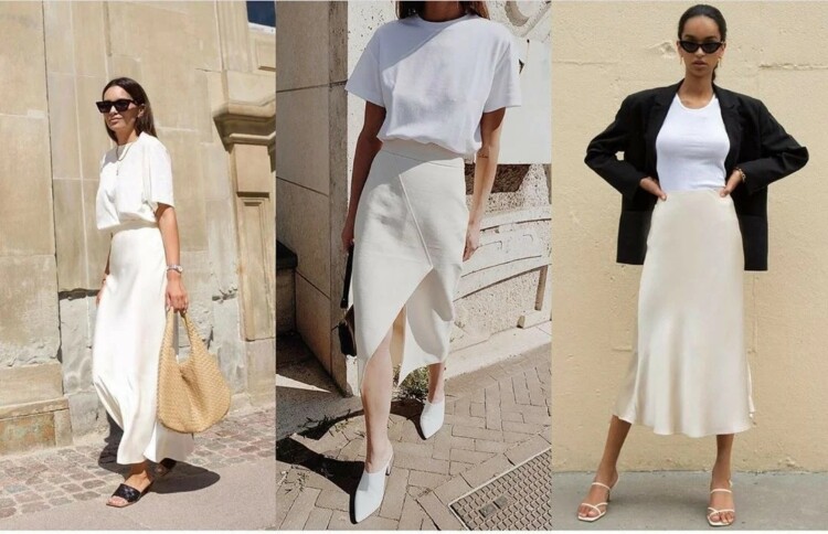 Влітку в класичній офісній спідниці з костюмної тканини може бути жарко і некомфортно. Та й за холодний сезон вона приїдається. В якості альтернативи можна взяти однотонну атласну спідницю в довжині міді. Вона універсальна і виглядає дуже стримано, а завдяки благородному сатиновому блиску зробить зовнішній вигляд дорожче. Носити її можна з будь-якими верхами на ваш смак і дрес-код.