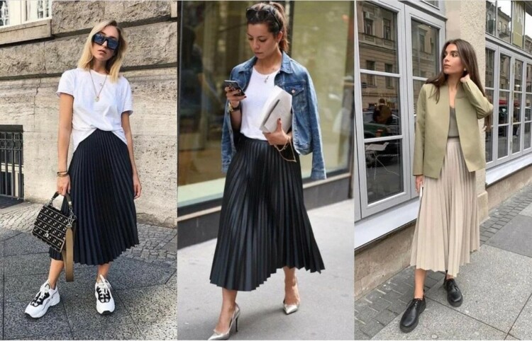 Комплекти, побудовані на спідниці-плісе, завжди виглядають в міру строго і дуже жіночно. Це теж відмінний варіант уніформи для робочого гардеробу на літо. Поєднуйте їх зі спокійним верхом в нейтральному тоні, поверх навіть можна накинути піджак – він ще краще збирає образ і надає строгості. Взуття підійде будь-яке – від човників до кросівок.