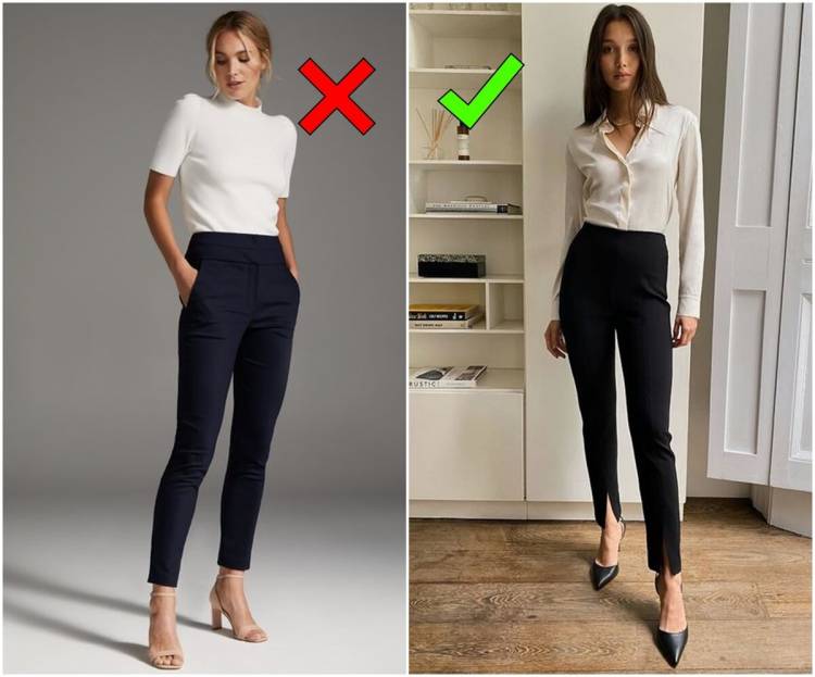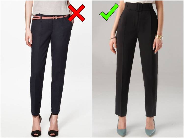 Часта помилка офісного гардероба – велика кількість “класичних” брюк-дудочок на низькій посадці, нерідко вони йдуть в комплекті з тоненьким ремінцем, як на фото зліва. Пам’ятайте про те, що низька посадка сильно спотворює пропорції тіла: ноги здаються коротшими, сорочки з таких брюк постійно виправляються і весь зовнішній вигляд від цього виглядає неохайно.