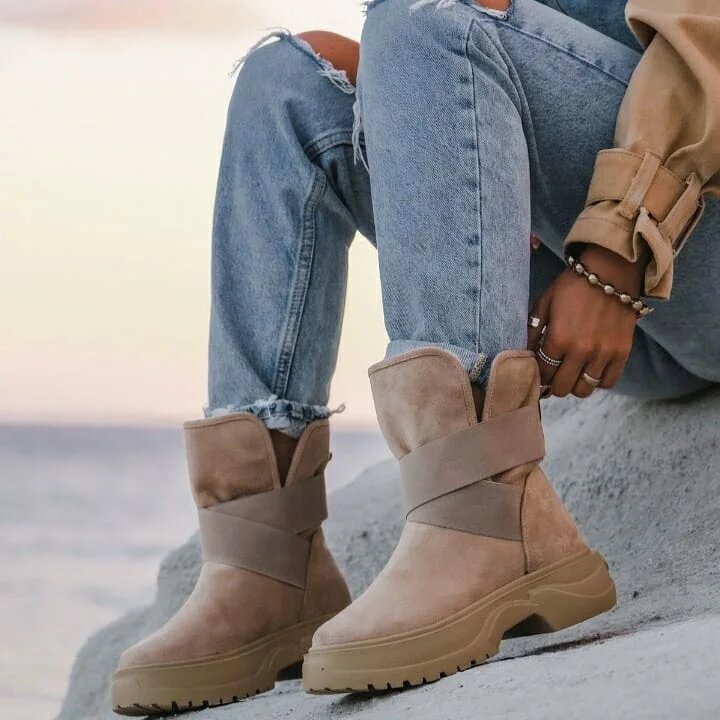 Так, цієї зими ви можете спробувати стильну модель, яка нагадує слоучі. Вони відрізняються широкою халявою, зібраною в гармошку в області щиколотки або гомілки. Універсальне забарвлення в бежевому кольорі зробить взуття ще більш жіночним і універсальним.