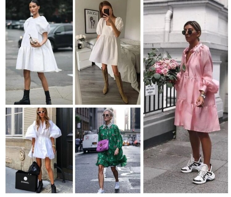 Під “ляльковими” маються на увазі сукні-міні вільного крою з повітряної об’ємної тканини – бавовни, наприклад. Вони дуже йдуть тендітним струнким дівчатам. Восени поєднуємо їх з кросівками або грубими черевиками, як верхній шар беремо піджак або куртку-косуху – вийде дуже стильний і трендовий комплект.