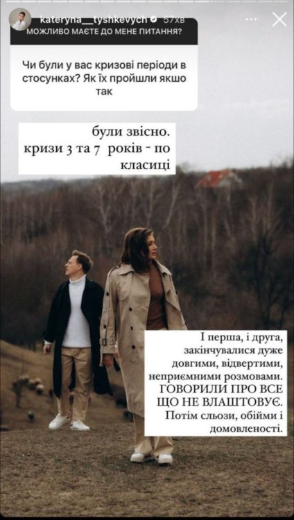 Українська акторка Катерина Тишкевич відверто поділилася своїм досвідом пройдених криз у стосунках зі своїм чоловіком, також актором, Валентином Томусяком, і висловила своє ставлення до пристрасті у шлюбі.