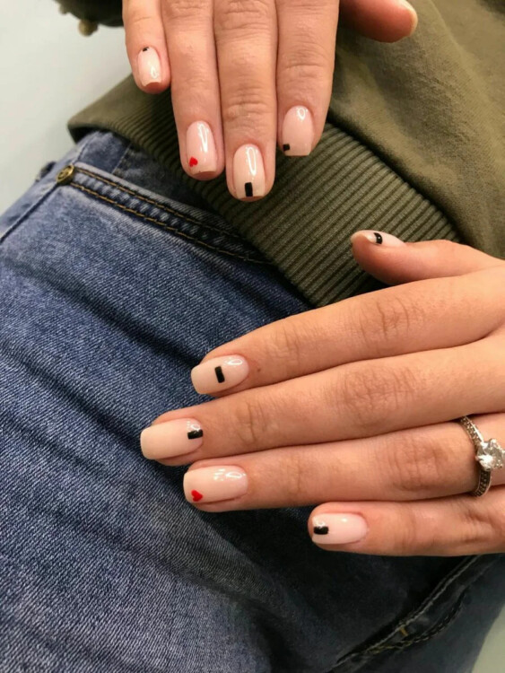Nail майстри пропонують різні види дизайнів в мінімалістичному стилі такі, як: геометрія, тваринні принти, флористика, абстракція і інші варіанти, але головне щоб манікюр не був перевантажений дизайном і не виникло відчуття перенасичення на нігтях.