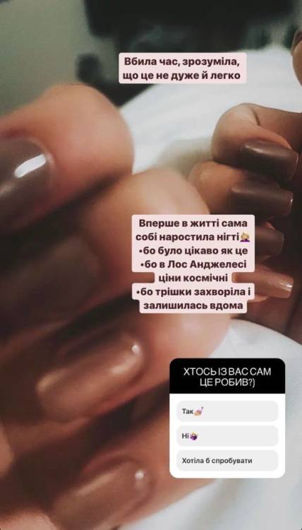 “Вбила час, зрозуміла, що це не дуже й легко. Вперше в житті сама собі наростила нігті. Бо було цікаво як це. Бо в Лос-Анджелесі ціни космічні. Бо трішки захворіла і залишилась вдома”, – поділилася Гросу.