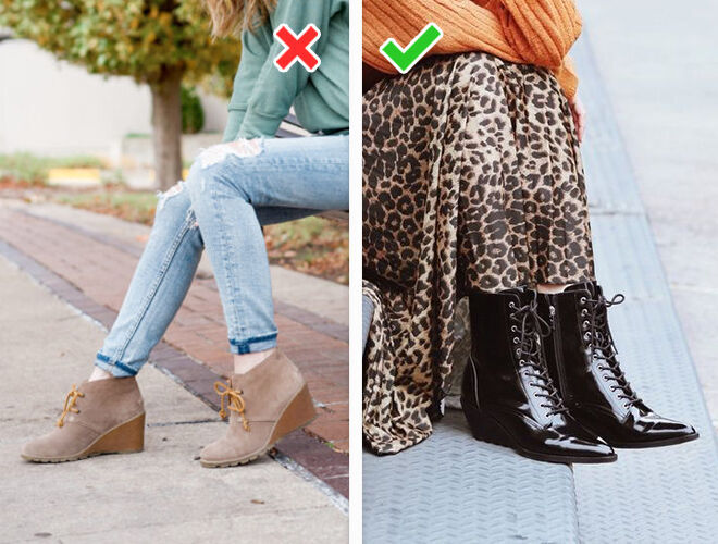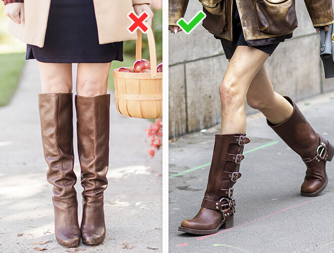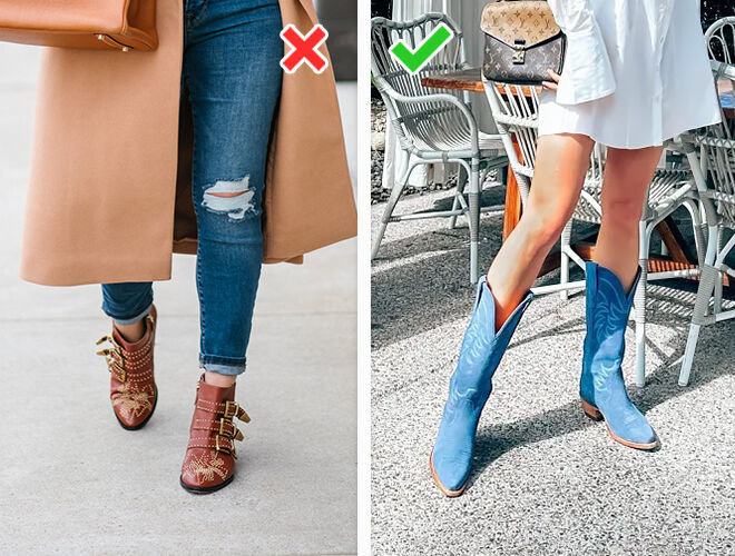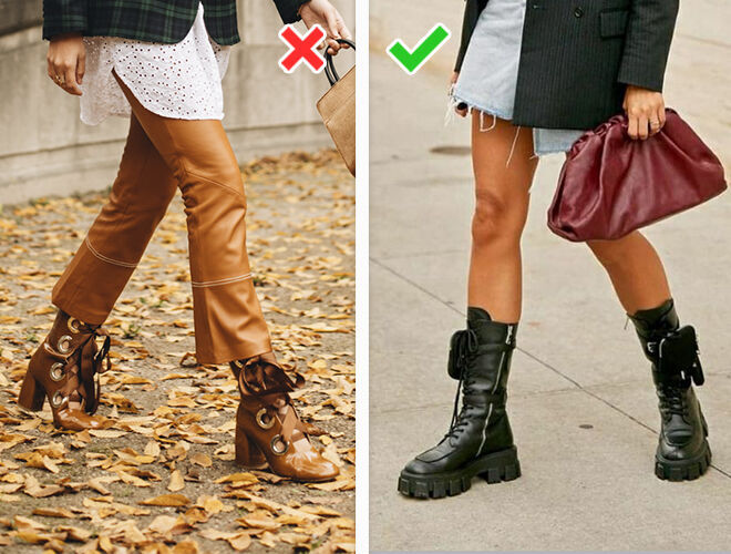 Застаріло: низькі козаки з широким верхом, заклепками, безліччю пряжок. Однозначно роблять образ старомодним і не поєднуються навіть із базовими речами на зразок джинсів та прямих штанів.