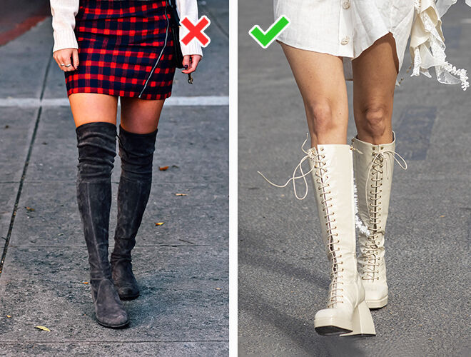 Застаріло: чоботи, що облягають, і ботфорти з тонкої замші. Ноги в них виглядають не найкращим чином: здаються товстими та перетягнутими. Жіночий образ буде зіпсований.