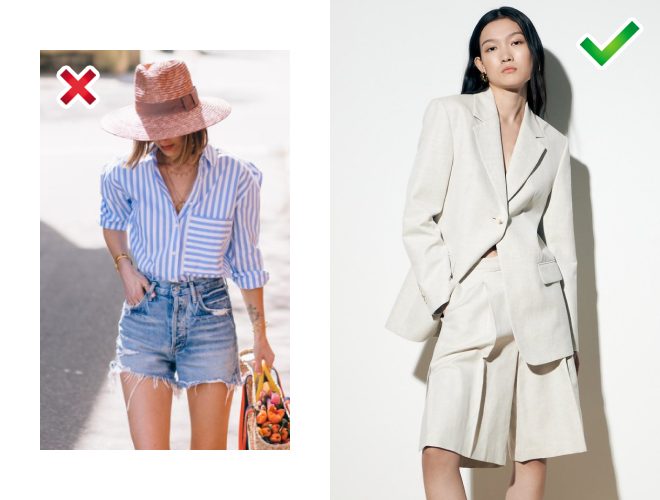 Короткі шорти виглядають вульгарно, недоречні для міста та підкреслюють будь-які недоліки фігури. Як стильну альтернативу вибирайте бермуди. Вони чудово сидять на різних типах фігур, універсальні та доречні навіть для офісу.