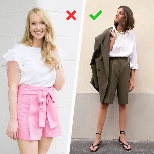 Не стильно: шорти, що вічно мнуться, з величезним бантом. Льон – дуже примхливий матеріал, тому краще не поєднувати його зі складним кроєм, щоб не отримати неохайний образ, як на фото зліва. Та й бант краще лишити для дитячих образів.