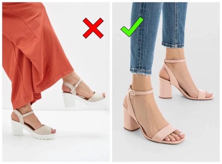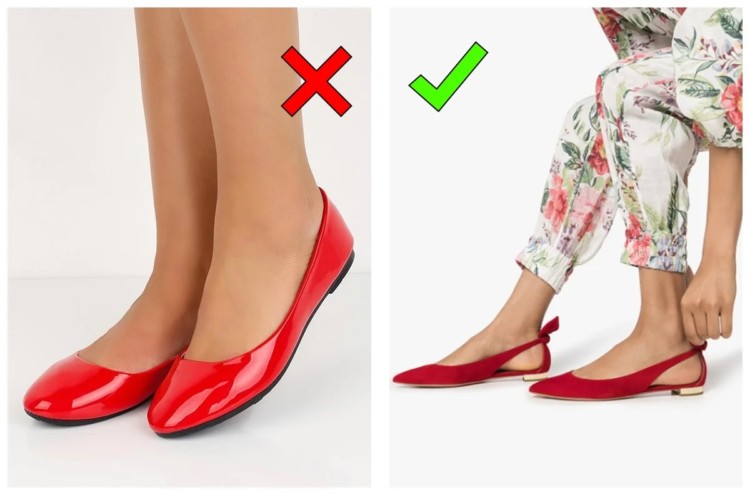 Балетки з круглим носом, схожі на змінне взуття учениці середньої школи, виглядають старомодно, а ще спотворюють пропорції тіла, роблячи ноги непропорційно повніше і коротше. Сучасна альтернатива – це, наприклад, гостроносі балетки, схожі на туфлі без підборів. До речі, символічні підбори менше сантиметра заввишки зроблять балетки більш представницькими.