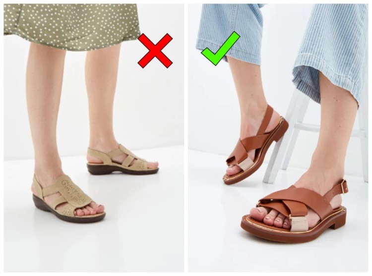 На фото зліва, такі сандалі не виглядають стильно, нікого не прикрашають. Актуальні сандалі мають мінімалістичний, але стильний дизайн. Також добре виглядають класичні сандалі в грецькому стилі і трендові на спортивній підошві.