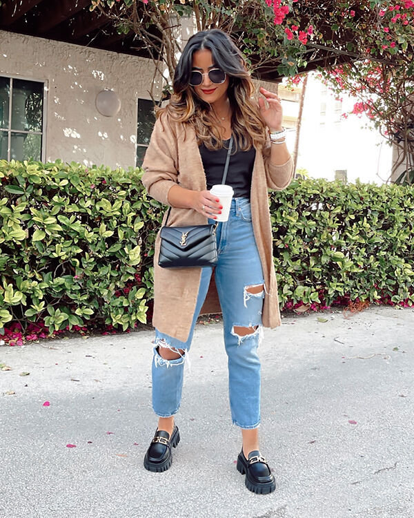 В образі на фото відмінно підійдуть прямі однотонні моделі без рваностей, але з ледь помітними потертостями. Разом з лоферами на платформі вийде чудовий аутфіт на навчання та в офіс.