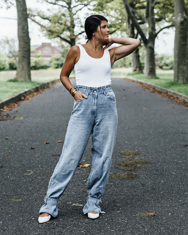 Об’ємні штани баггі на кулісці знизу і на талії – тренд і заміна карго. Але це не стосується джинсів, тим більше моделі як на фото. Пояс на резинці виглядає недоречно в сучасному аутфіті, робить із джинсів шаровари, а куліски на ремінцях по низу штанин візуально спотворюють ноги. Переконливі аргументи, щоб не носити подібні моделі цієї осені взагалі ніколи.