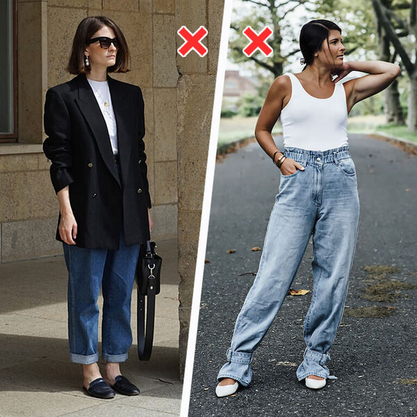 Немає нічого, що вкорочувало і товщало ноги так, як це роблять джинси баггі з підворотами. У поєднанні з подовженим піджаком та взуттям на плоскому ходу отримуємо непоказну фігуру та дивний образ.