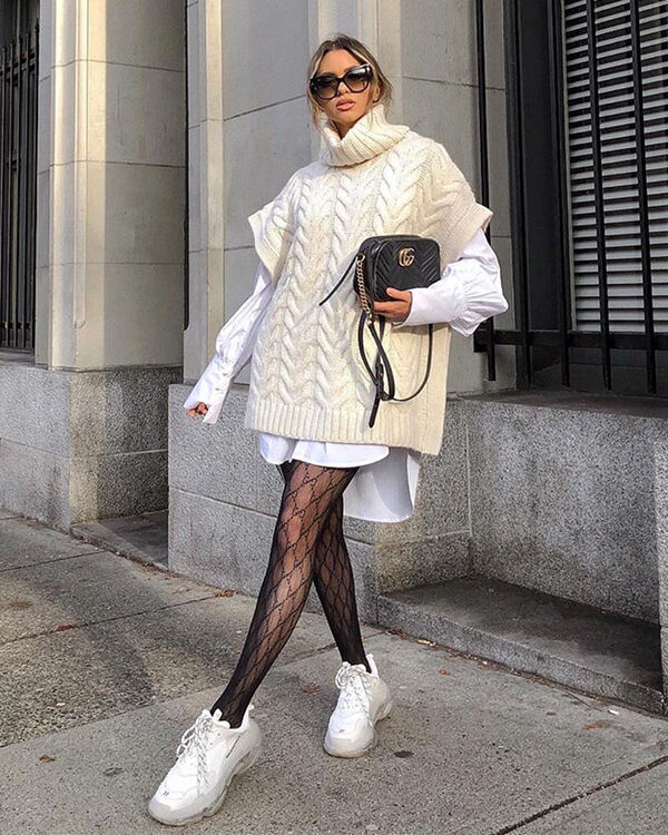 В образ із пуловером стилісти рекомендують підбирати щільні шкарпетки, щоб поєднання виглядало гармонійно. Тут капронові панчохи не дружать із вовняним светром — вони б виглядали крутіше з бавовняною блузою чи сорочкою.