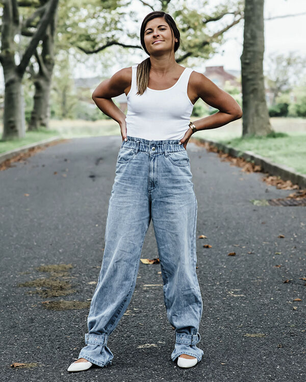Джинси на фото однозначно не підходять дівчині ні за зростанням, ні за комплекцією. Кльош із високою посадкою чи джинси мом візуально зробили б ноги довшими, а талію — тоншими.