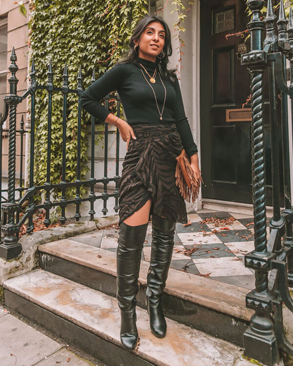 Прикро, коли трендовий анімалістичний принт губиться у неправильно зібраному образі. Оригінальний крій та малюнок спідниці залишилися непомітними: чоботи у складку, клатч з бахромою та тонка водолазка роблять образ дешевим, взуття та аксесуари сперечаються один з одним.