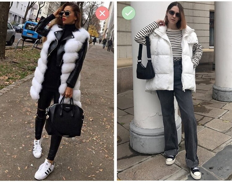 Такі жилети, як на фото зліва, вже давно і безповоротно застаріли, проте на вулиці зустрічаються регулярно, що дуже засмучує. Якщо ви хочете носити жилет і при цьому виглядати сучасно, то вибирайте актуальну альтернативу. Зокрема, об’ємний дутий жилет, як на фотографії справа.