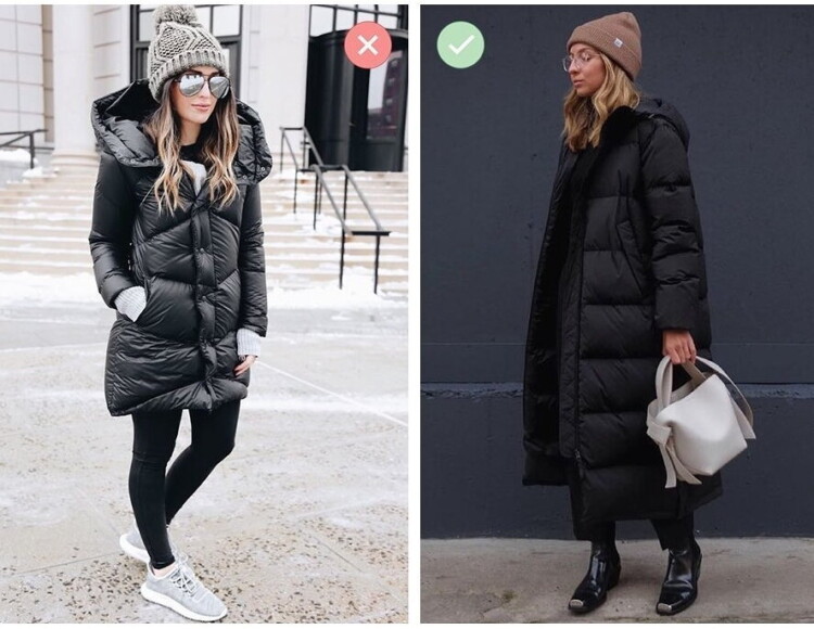 Пуховик ні в якому разі не повинен сидіти на вас в обліпку, як на прикладі зліва. Там явно занадто тісна модель, в той час, як між верхнім одягом і тілом має бути достатньо вільного простору. Інакше це несучасний і не функціональний верхній одяг, який погано зігріває і псує зовнішній вигляд.