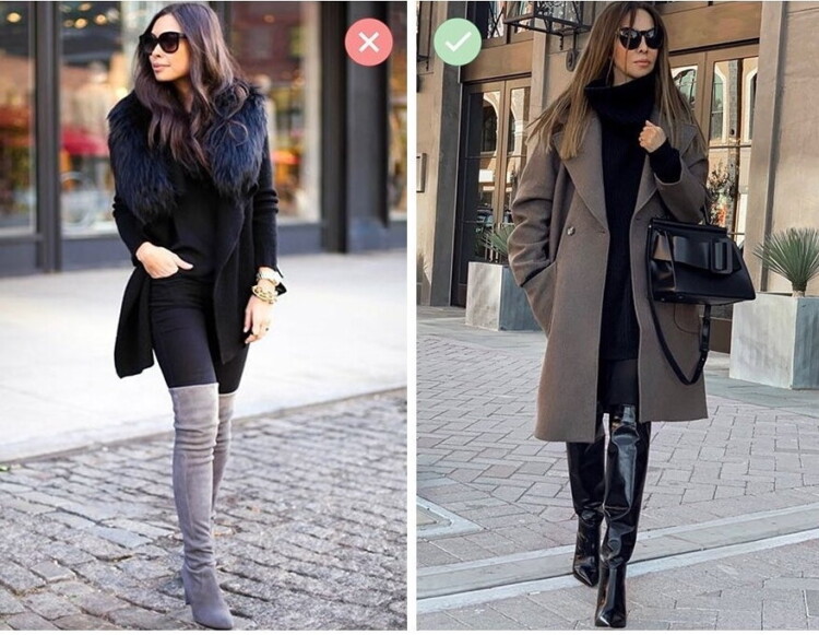 Обтягуючі велюрові і замшеві ботфорти як і раніше залишаються зимовим антитрендом. Вузькі шкіряні ботфорти носити можна, але тільки якщо ви не будете заправляти в них штани, інакше образ буде застарілим. А ось якщо чоботи у вас з широкою халявою, то в них штани заправити можна – вийде дуже сучасна стилізація.