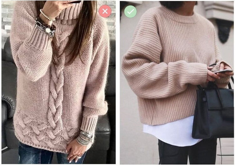 Чим простіша у светра / джемпера в’язка, тим імовірніше, що він буде актуальний. А ось те, що ми бачимо на фото зліва, явно віддає старомодністю. Крім того, базовий светр без вигадливого дизайну набагато легше комбінувати з нижніми шарами (сорочки, футболки) і з прикрасами.