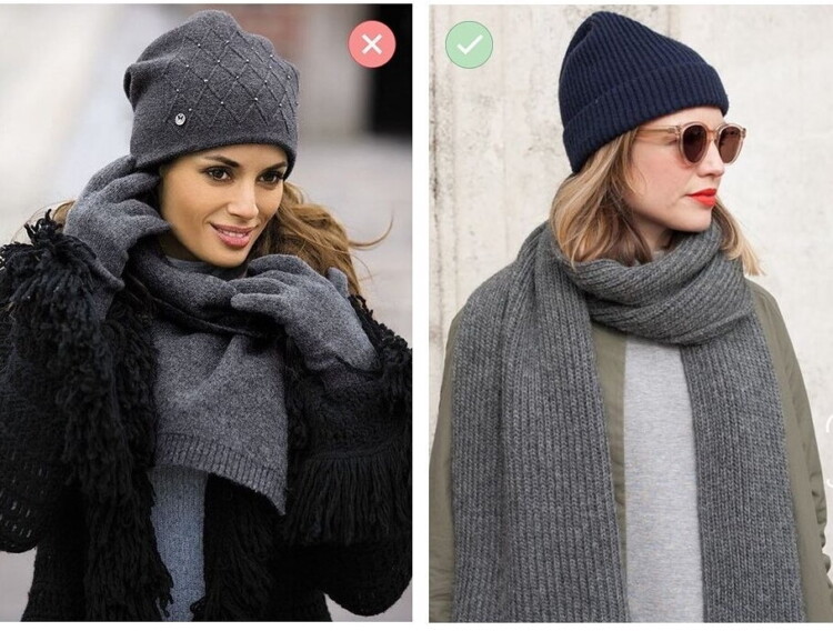 З шапками ситуація аналогічна. Чим простіше і лаконічніше у неї дизайн, тим більша ймовірність, що шапка актуальна. Незвичайна в’язка, складний декор і інші прикраси шапку абсолютно не красять, а навпаки роблять її антитрендом. А якщо ви підбираєте шарф, то краще, щоб він відрізнявся від шапки або за кольором, або за фактурою.