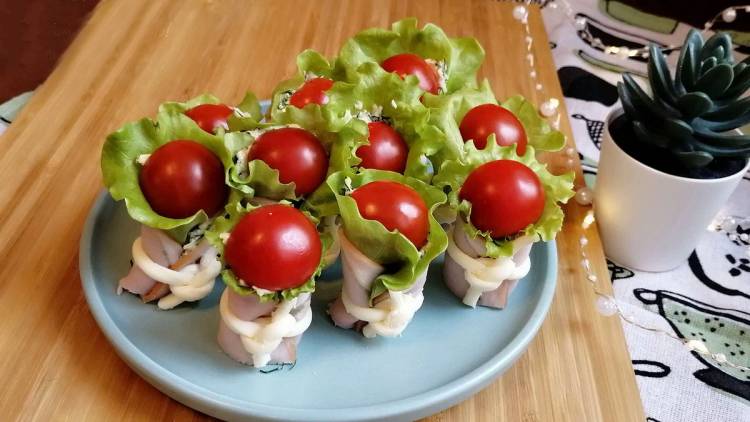 Зверху на кожен рулетик, що вийшов, викладаємо шапочку з помідорів.