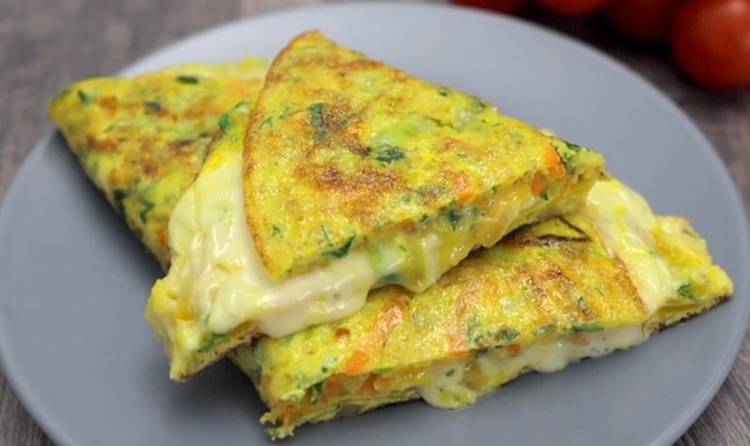 Потім зверху викладаємо сир і складаємо навпіл омлет. Готуємо ще 1-2 хвилини під закритою кришкою.