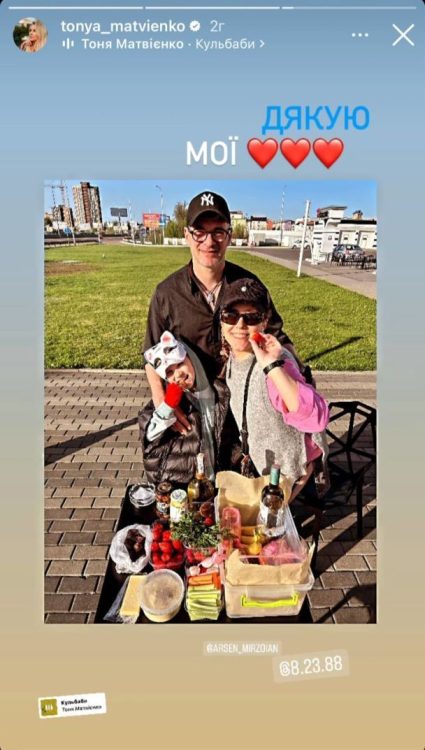 Також артистка поділилася фотографіями, на яких її привітали старша донька Уляна та молодша Ніна Матвієнко. Разом з ними на знімку з’являється та Арсен. Для Тоні вони підготували невеличкий сюрприз та зустріли її зі смаколиками на вулиці.