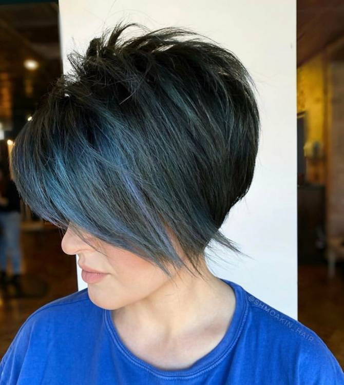Асиметричний боб завжди виглядає стильно та сучасно, а також створює молодіжний образ. Чубчик надає ефектності. Зачіска чудово змінює зовнішній вигляд і допомагає стати свіжішою та елегантнішою. Дівчина виглядає доглянутою та акуратною.