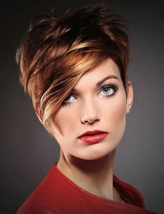 Власниці овального обличчя не обмежені у виборі, під цю форму підійде будь-яка варіація зачіски. Цікаво буде виглядати Пікс без проділу.