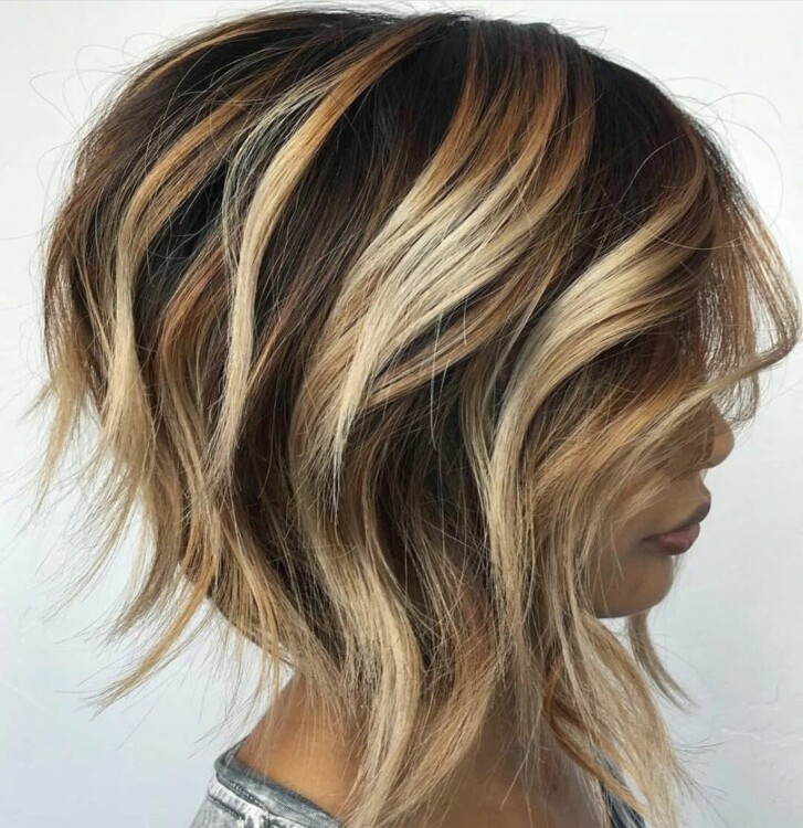 Рваний багатошаровий боб – приваблива стрижка, яка крім об’ємної верхівки і довгих пасом спереду доповнює образ філірованими кінчиками;
