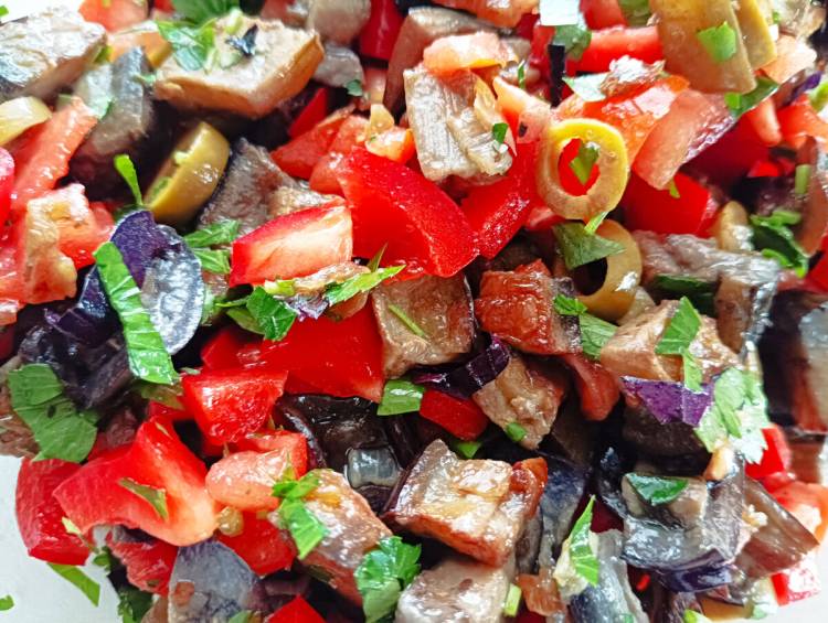 Зелень подрібнюю та додаю до баклажанів. Все змішую у глибокій мисці. Можна нічим не заправляти: олії від обсмажування цибулі та баклажанів та помідорного соку буде цілком достатньо.