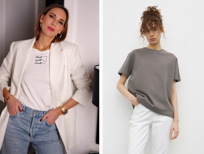 Це ще один елемент, без якого неповний базовий гардероб. Нехай футболка буде із щільної тканини, вільного крою та спокійних відтінків: білої, чорної, сірої чи бежевої. Принти допускаються, але не мультяшні: університетські, мінімалістичні написи чи абстракції.