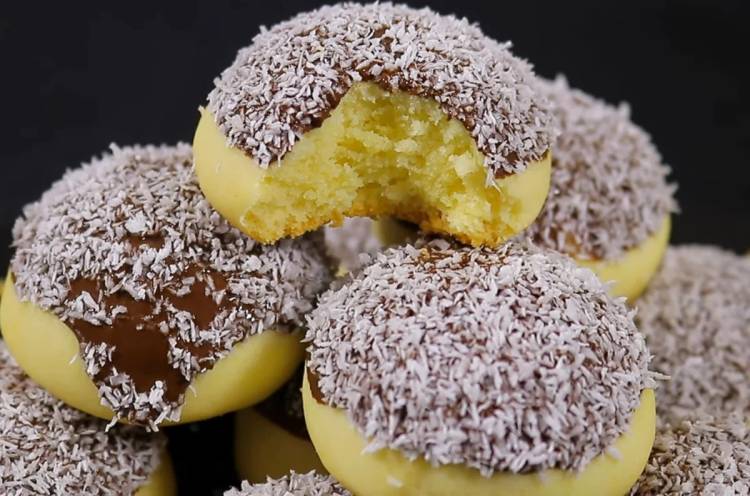 Готові кульки обмочуємо верхівкою у розтопленому шоколаді, потім одразу в кокосовій стружці.