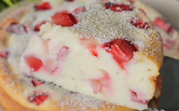 Викладаємо у форму двадцяти сантиметрів і зверху посипаємо ще трохи нарізаними ягодами. Запікаємо сорок п’ять хвилин, при температурі сто вісімдесят градус.