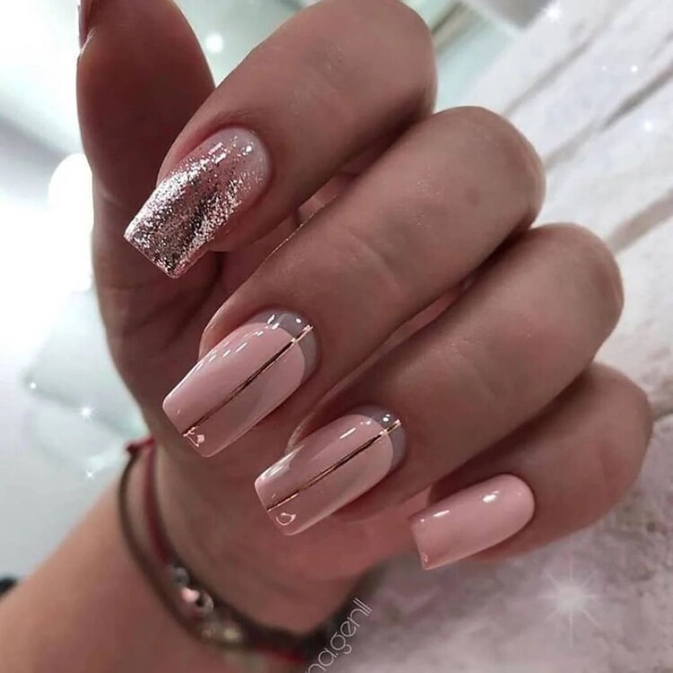 Не менш витончено і статусно в парі з бежевим покриттям виглядає глітер. Її сяюча основа – ідеальне рішення для святкового образу. Додати глітер ви можете у вигляді цікавого акценту на один ніготь або навіть за допомогою нього оформити френч.