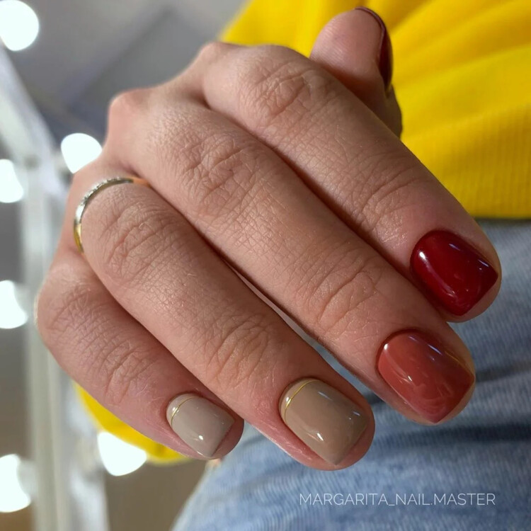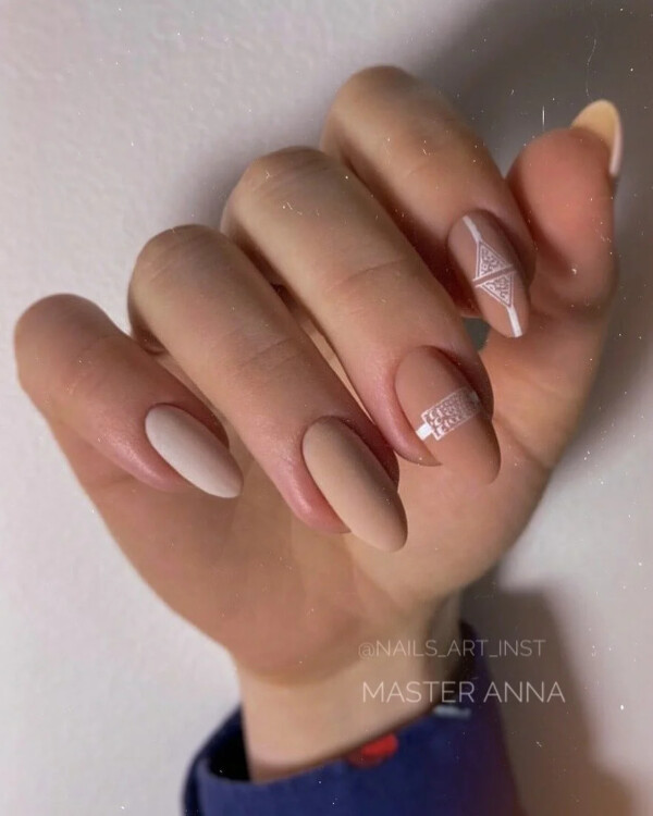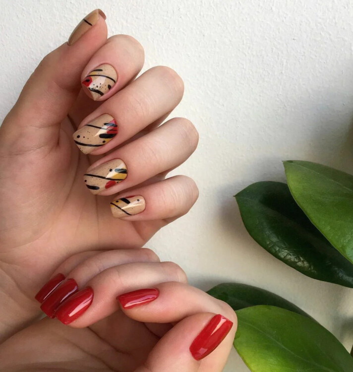 Чудовою альтернативою однотонному бежевому манікюру є оформлення в стилістиці фен-шуй. Підберіть відтінки, які поєднуються між собою і розфарбуйте ними всі нігтики по черзі.