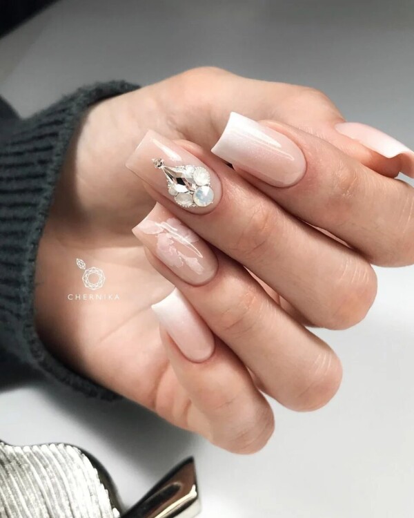 Хочете зробити гарний манікюр під вечірній образ або весільну сукню? Зверніть увагу на ніжний бежевий манікюр зі стразами. Ви можете використовувати блискучі камені будь-яких розмірів, форми і кольору і навіть доповнювати дизайн лаконічними малюнками або іншими видами декору.