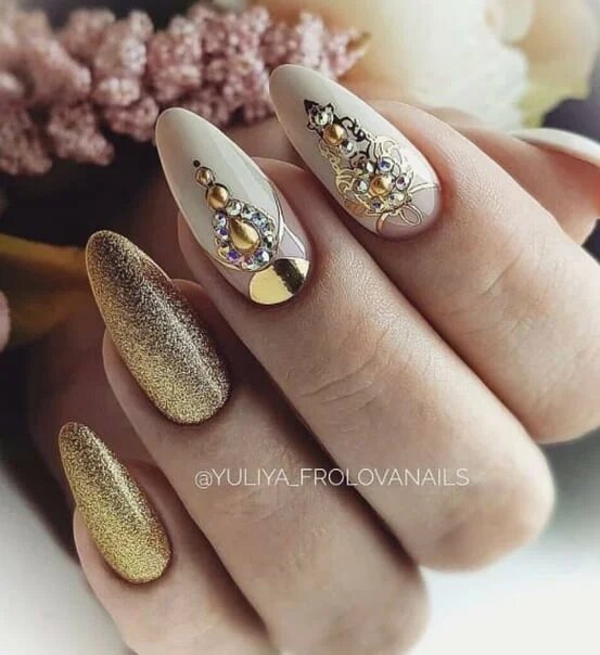 Якщо ви хочете створити цікавий вечірній манікюр – зверніться до бежевого манікюру з втіркою. Прекрасно буде виглядати перлова втірка, золота, глітер, голографічна. Таке покриття ви можете нанести як на цілий ніготь, так і тільки на якусь конкретну його частину, наприклад, на геометричний візерунок, як в прикладі нижче.