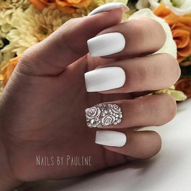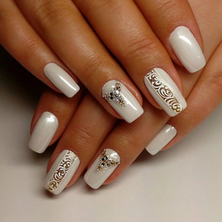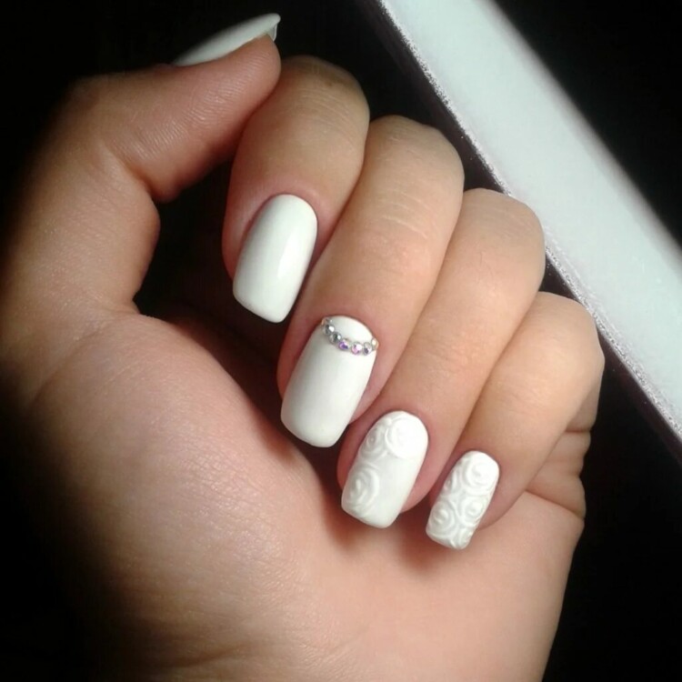 Білий манікюр можна виконати з перламутровою втіркою. Такий варіант зробить образ неповторним і стриманим. Також з білим манікюром прекрасно поєднуються стрази та блискітки, роблячи його ще більш привабливим.
